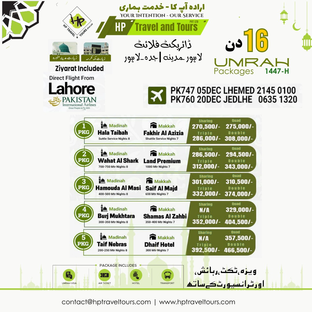 The 14, 15, 16 or 17 Days Umrah Package from Lahore – Pakistan offers the flexibility, comfort, and spiritual depth every pilgrim desires. Whether you prefer an economical stay or a VIP luxury package, HP Travel Tours ensures a smooth, reliable, and meaningful Umrah journey for 2025.